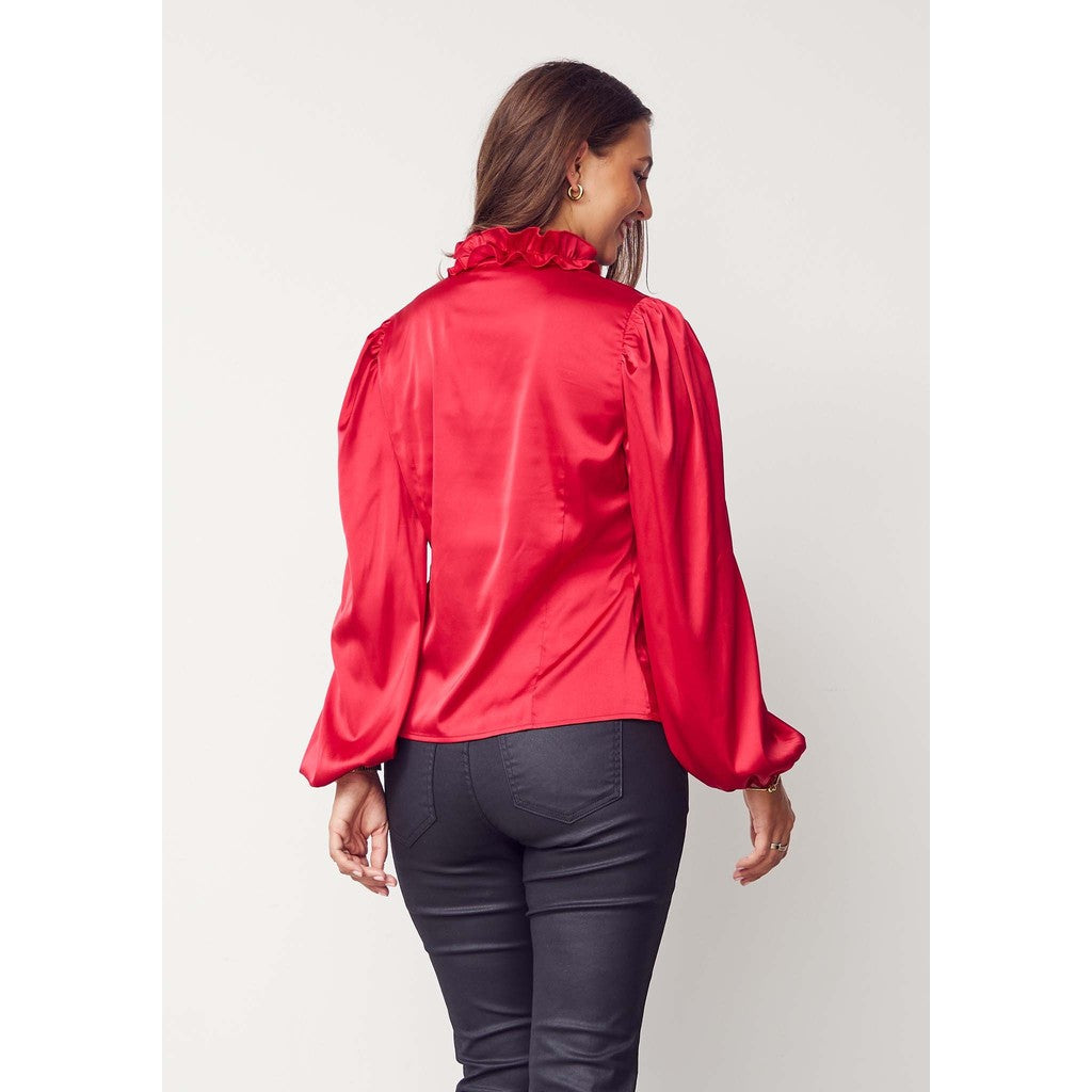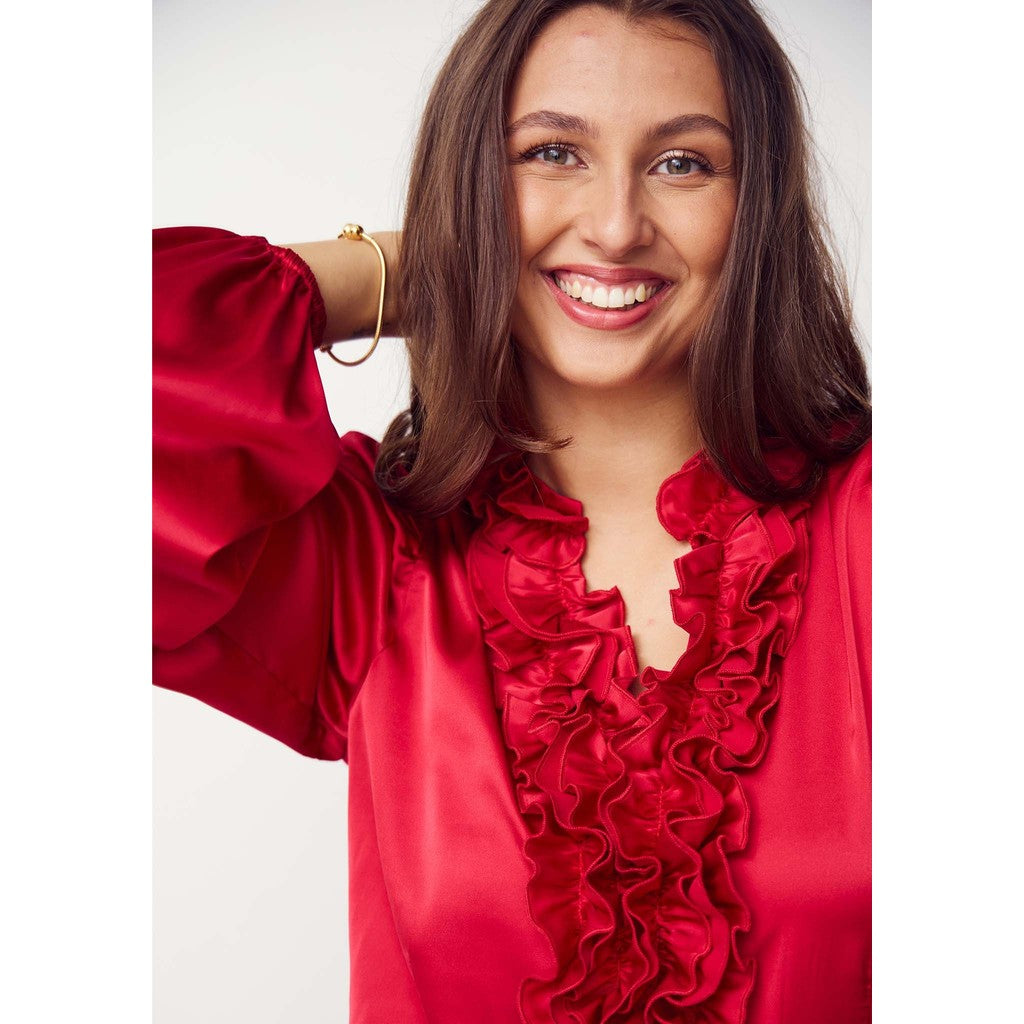 Gör ett elegant intryck vid din nästa speciella tillställning med denna långärmade blus. Steff Blouse är tillverkad i en mjuk satinkvalitet av 97% polyester och 3% elastan. Det karakteristiska draget med denna blus är de volangerna framtill och på kragen som lägger till en unik och iögonfallande detalj. Med sin lätt figursydda passform framhäver den din siluett på ett smickrande sätt. För en komplett stil kan du matcha den med våra matchande Steff-nederdelar och ett par eleganta klackar.