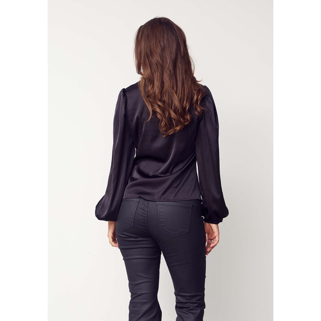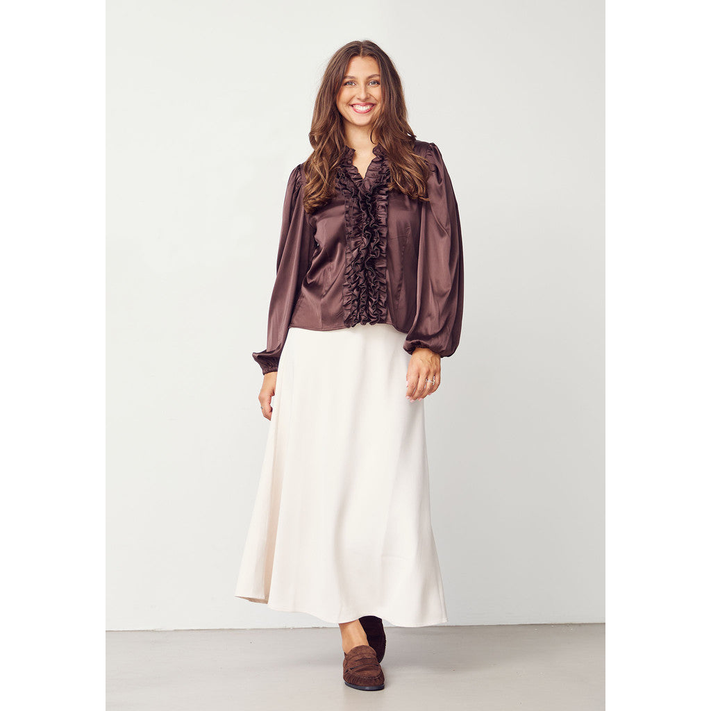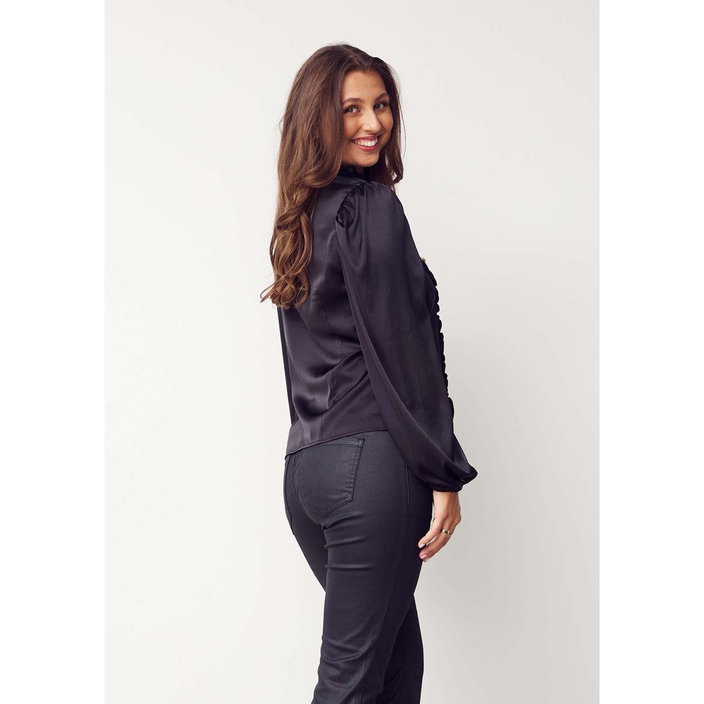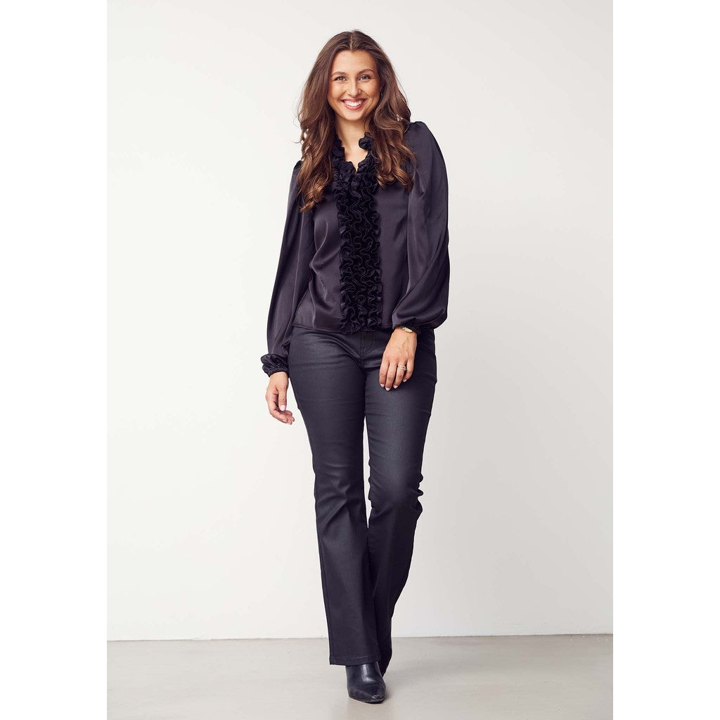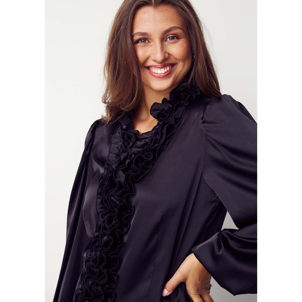 Gör ett elegant intryck vid din nästa speciella tillställning med denna långärmade blus. Steff Blouse är tillverkad i en mjuk satinkvalitet av 97% polyester och 3% elastan. Det karakteristiska draget med denna blus är de volangerna framtill och på kragen som lägger till en unik och iögonfallande detalj. Med sin lätt figursydda passform framhäver den din siluett på ett smickrande sätt. För en komplett stil kan du matcha den med våra matchande Steff-nederdelar och ett par eleganta klackar.