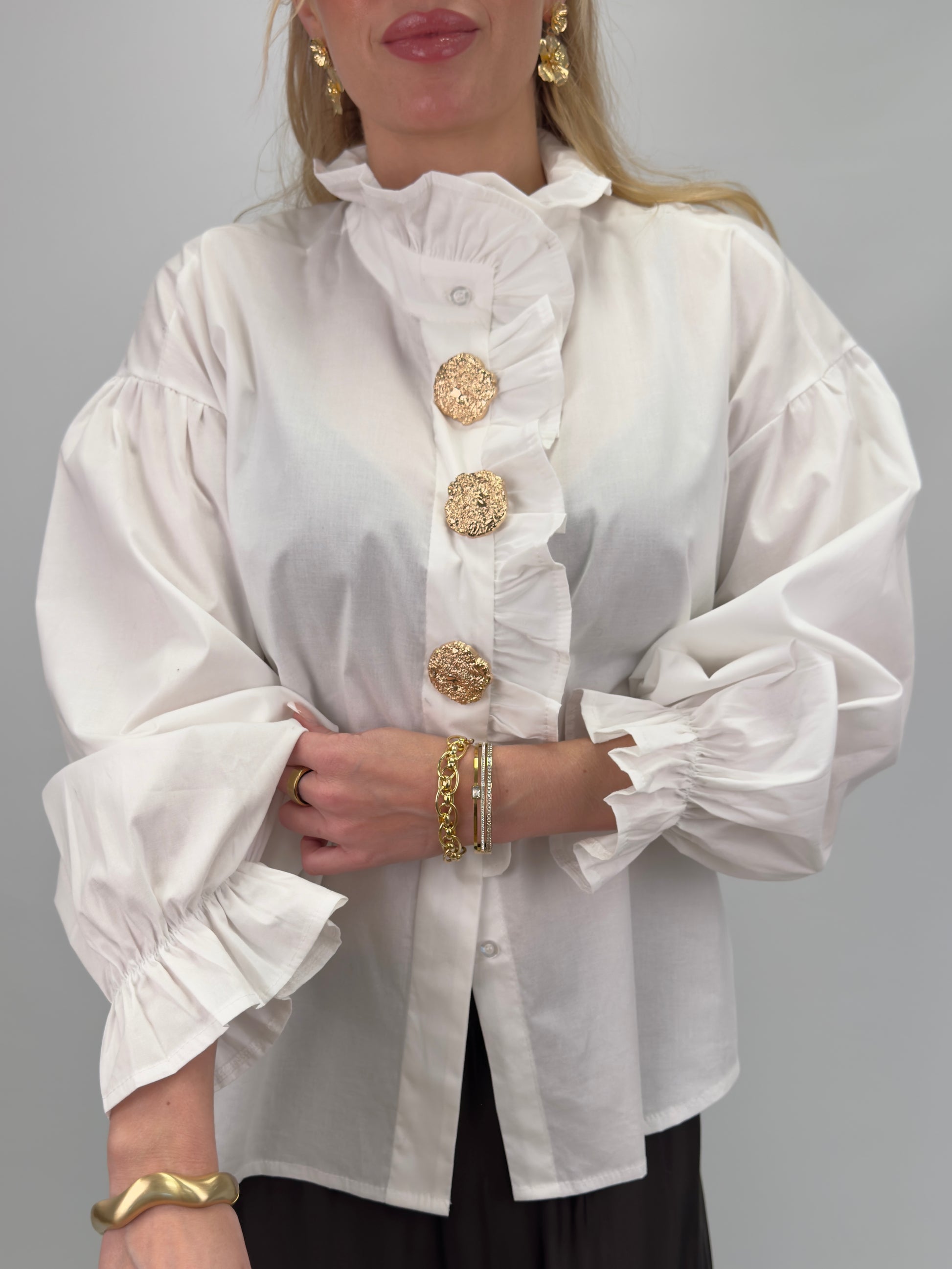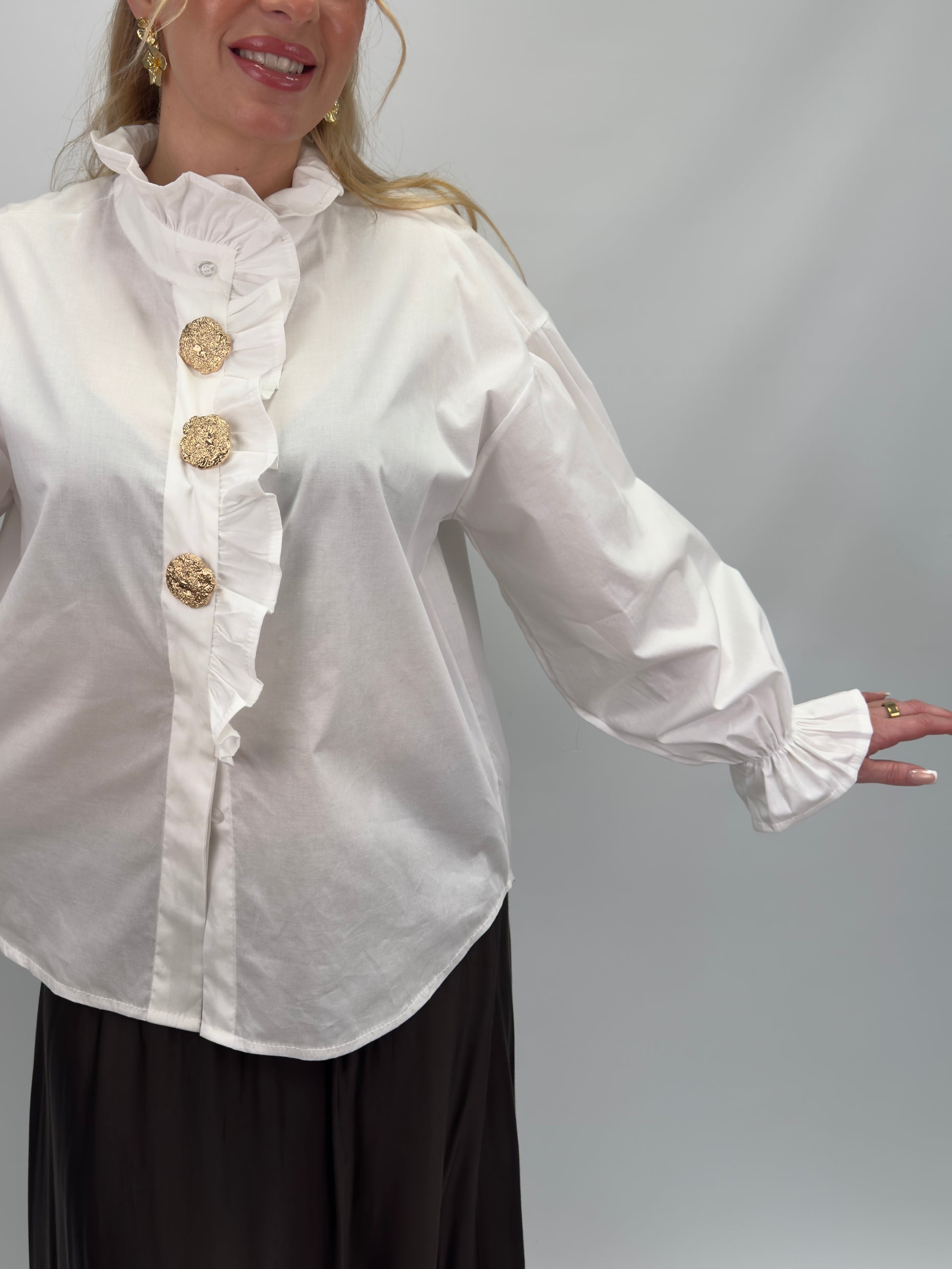 Evelyn är en bomullsskjorta med löstagbara broscher som knappar och volangdetalj längs knappslån. En unik och elegant skjorta som ger dig möjlighet att variera stilen. Perfekt att bära både till vardags och fest för en chic och personlig look.