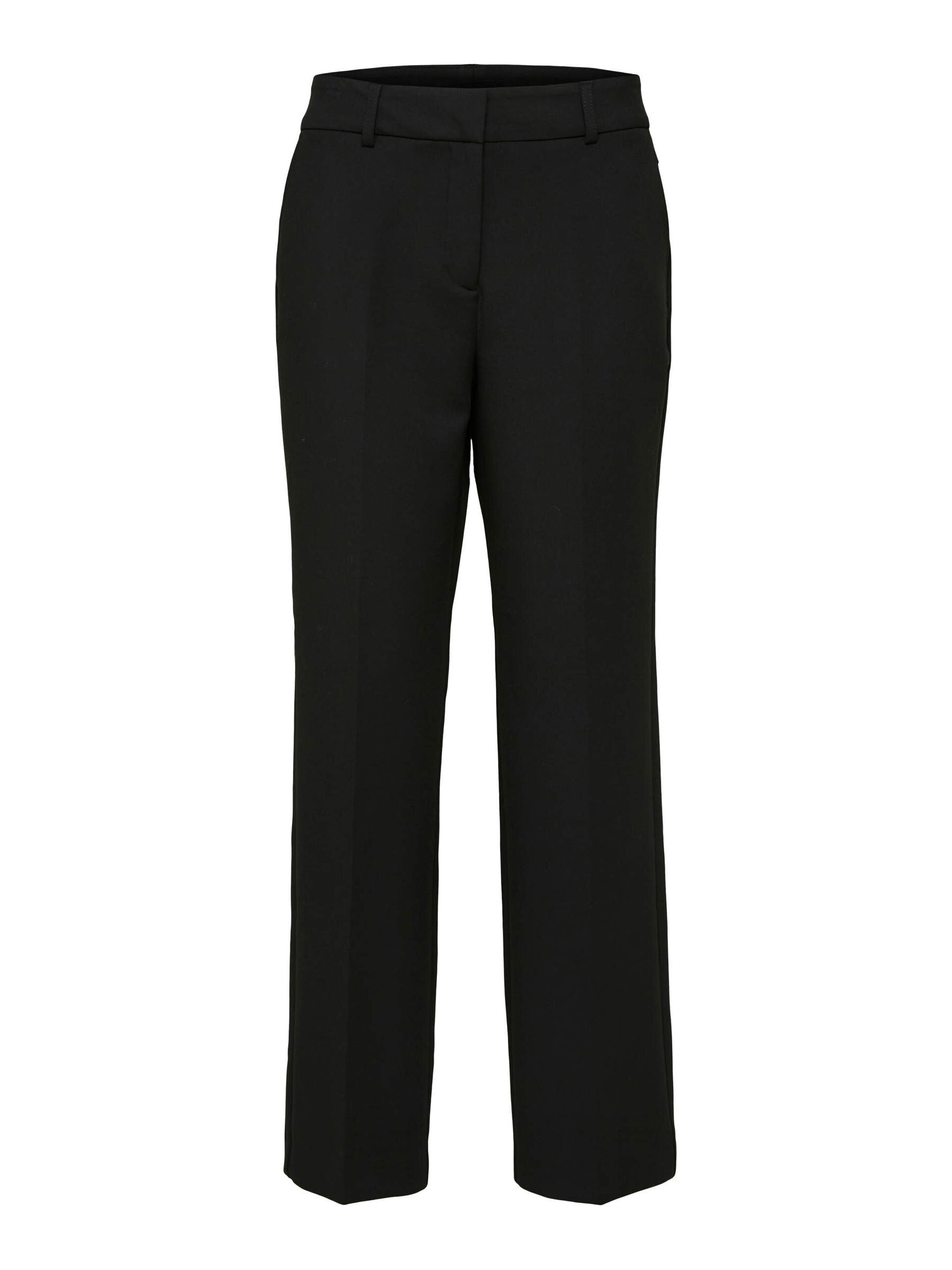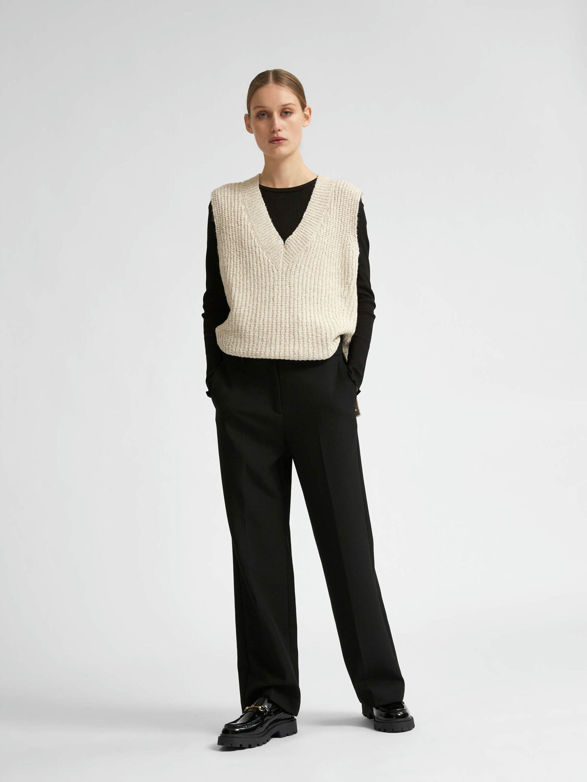 Alla behöver ett par vida byxor i sin garderob; de framhäver din midja, förlänger dina ben och kan stylas med nästan vad som helst. Dessa har normal midja med hällor som du kan stoppa in ditt favoritbälte i. De centrerade pressvecken lägger till ett sofistikerat skräddarsytt element, vilket gör dem lämpliga för både formella och vardagliga evenemang. De är tillverkade av återvunnet material vilket också gör dem till ett mer miljövänligt alternativ. Prova att bära dem med en tjock, stickad tröja för att blanda texturer och ta på dig ett par kraftiga loafers för lite höjd.