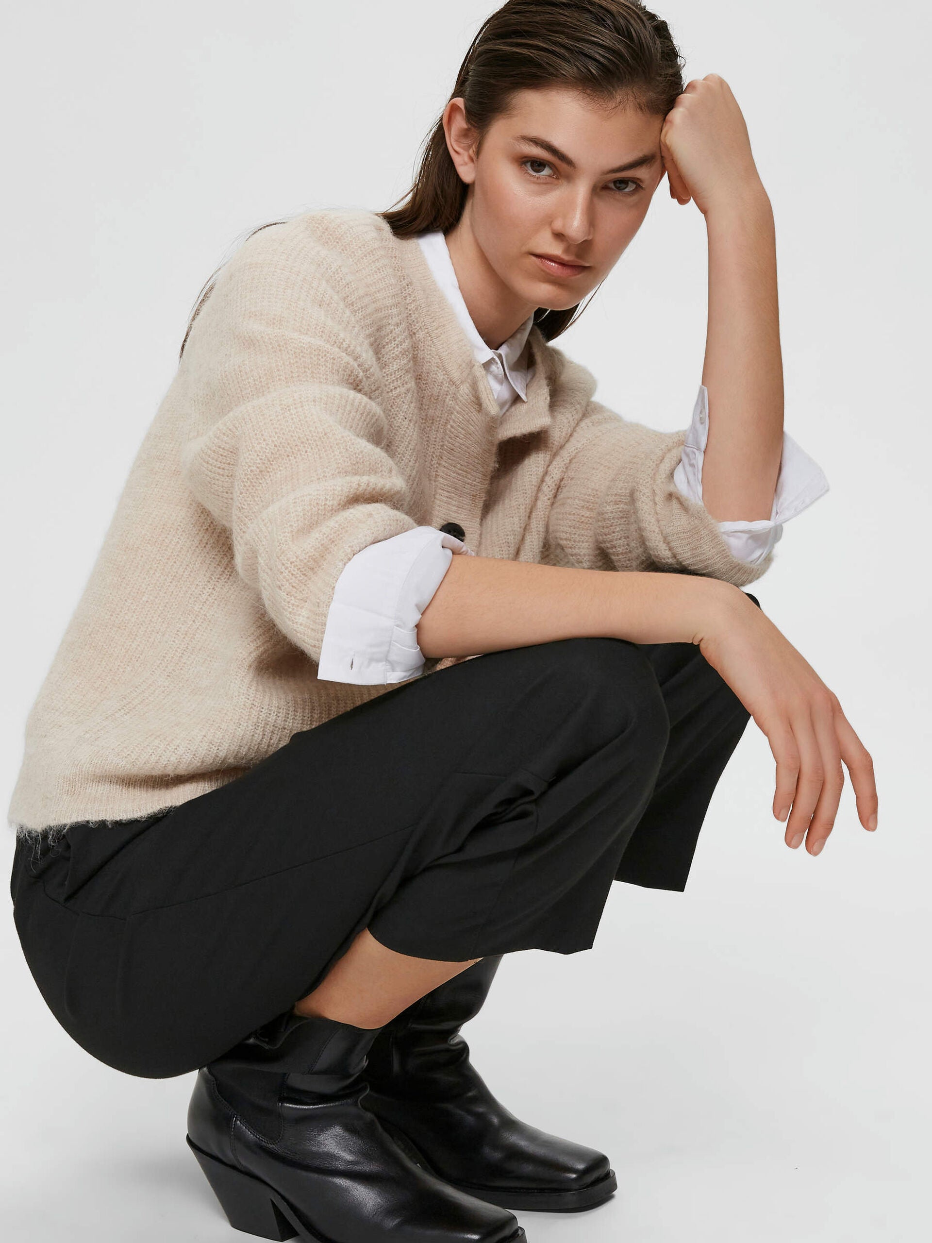 Finns det något bättre än att slänga på sig en mysig kofta en kylig dag? Denna kofta är gjord av en mjuk alpacka-ullblandning med lite stretch för extra komfort. De långa raglanärmarna har drop stitch-detaljer och slutar i åtsittande, ribbade manschetter. Vi skulle styla den med ljustvättad denim eller en minikjol i läder.