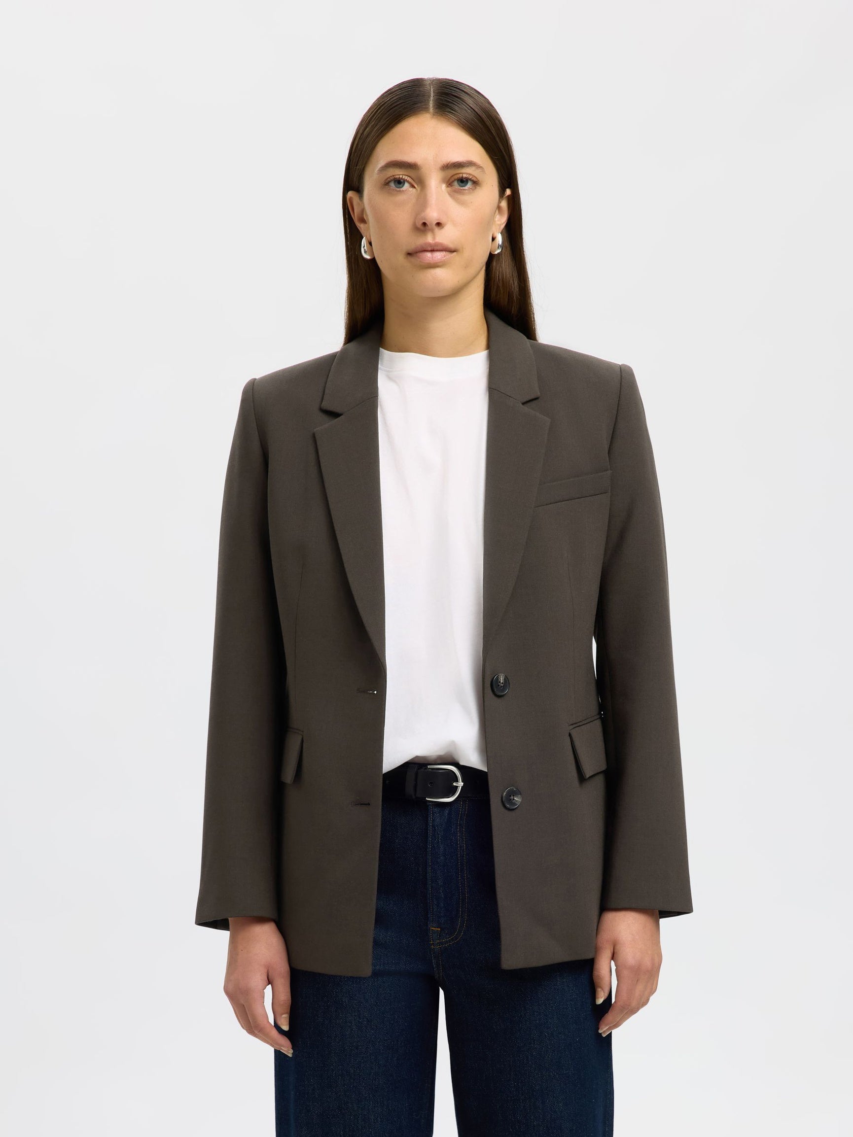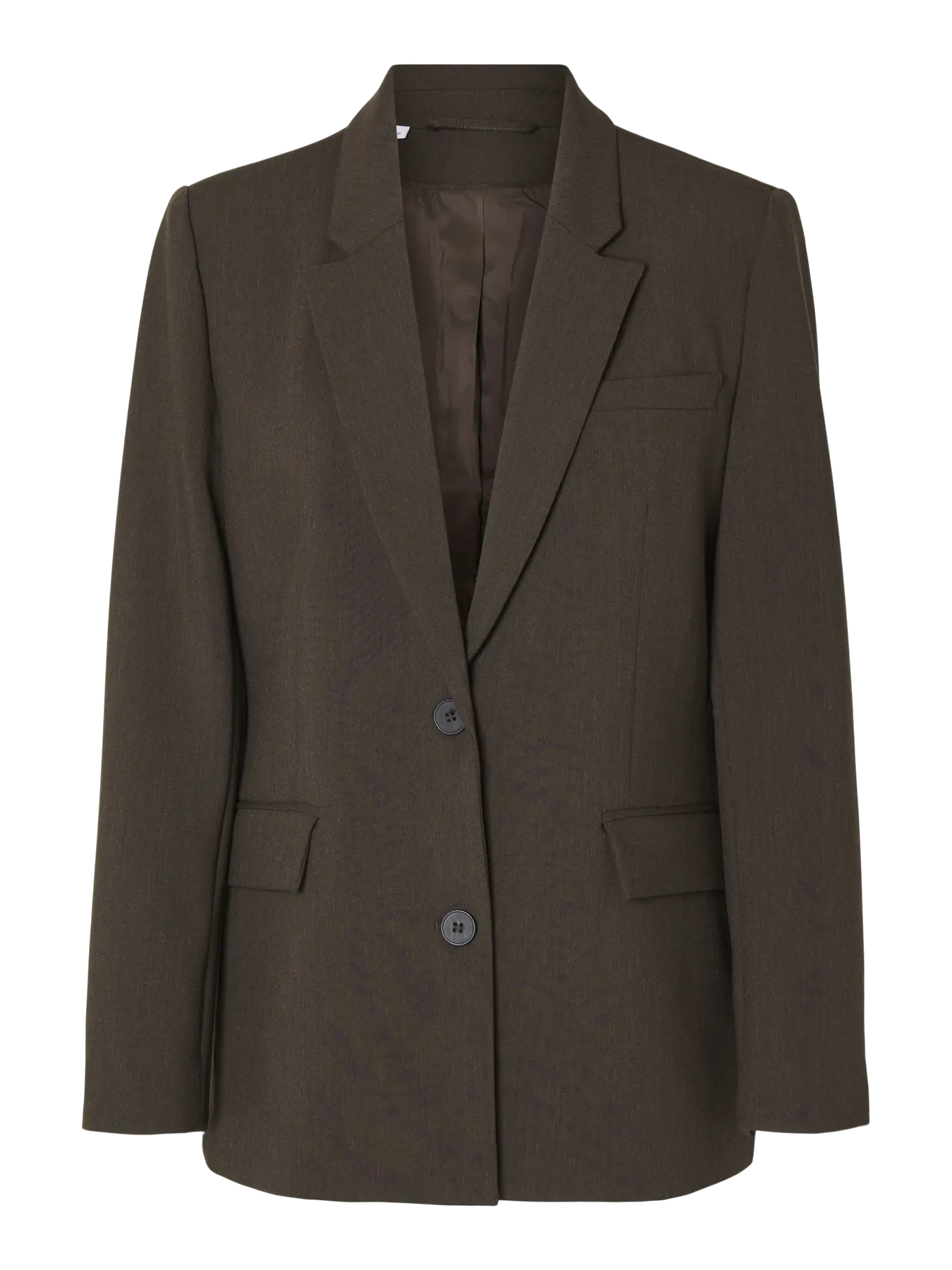 Håll det klassiskt med denna enkelknäppta kavaj. Den har en tidlös skräddarsydd passform som gör dina proportioner strömlinjeformade och passar bra till alla dina andra plagg, från skjortor och blusar till avslappnade T-shirts. Bär den som en tvådelad kostym med våra matchande byxor och lägg till en kortärmad, stickad topp och kraftiga läderloafers.