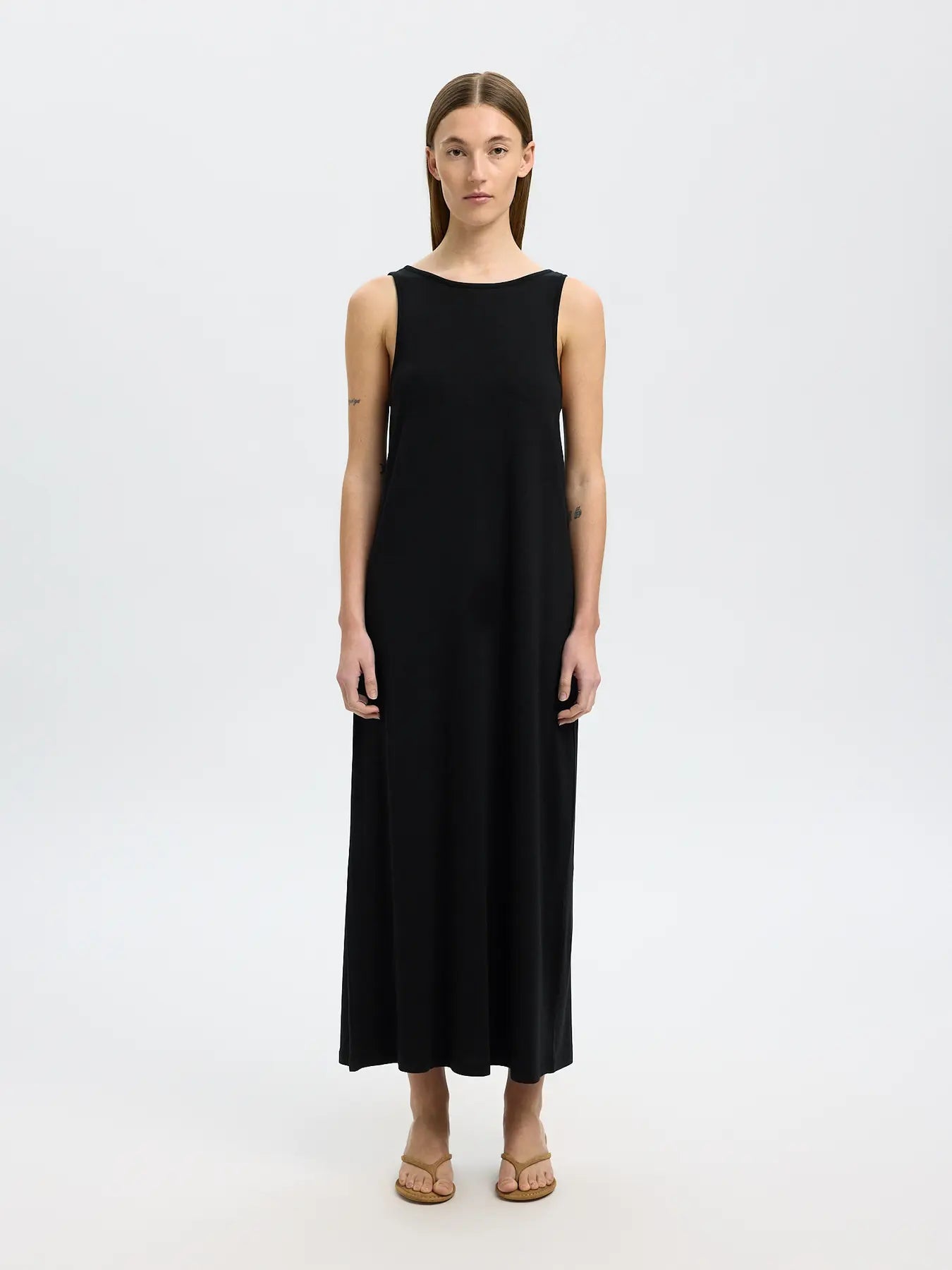 Säg hej till din nya sommarfavorit. Den här enkla men eleganta klänningen har låg rygg och ett bälte som du kan använda för att dra åt midjan. Lägg till gympaskor i läder och en denimjacka.