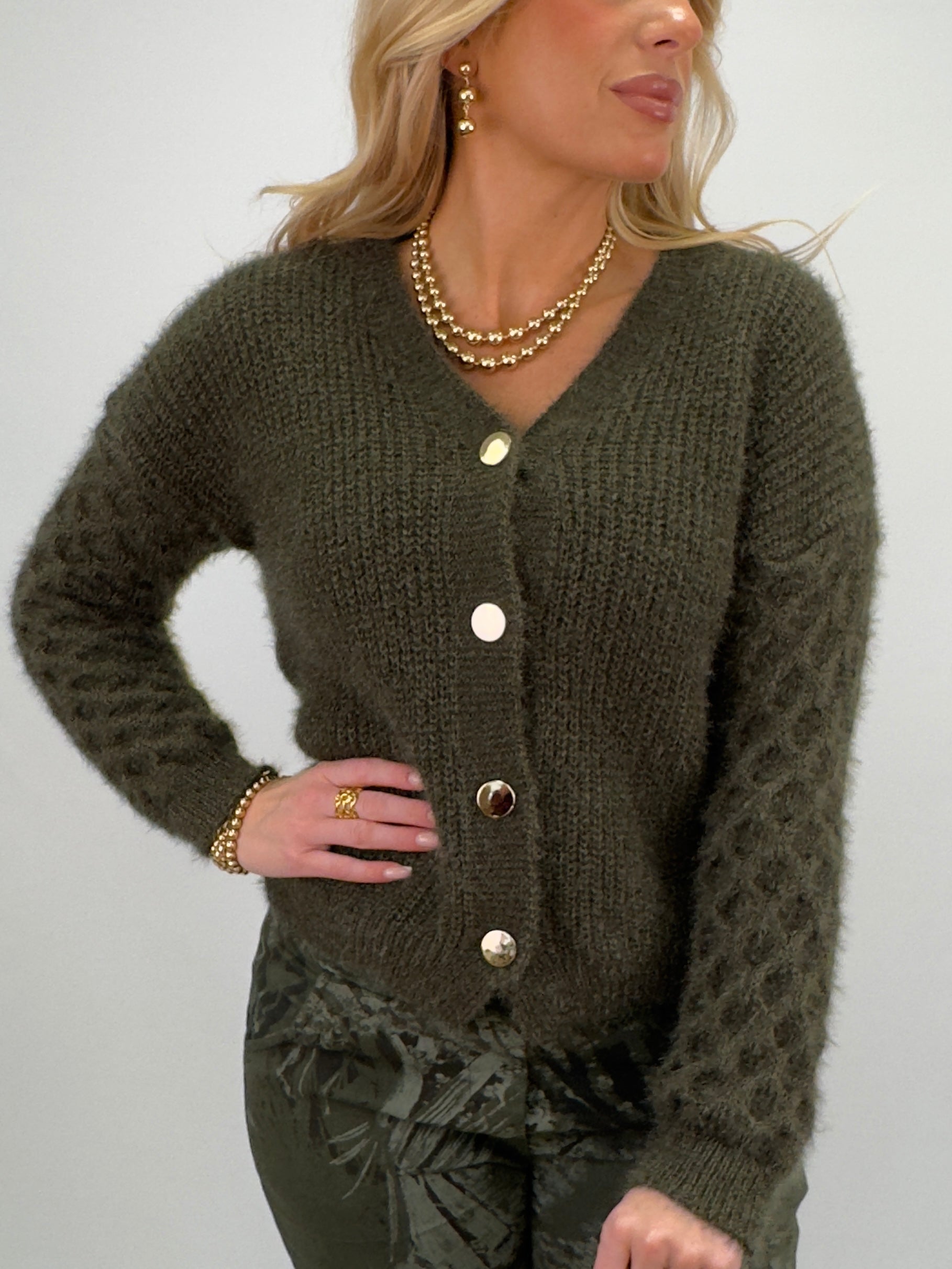 Siv är en mjuk stickad kofta i ullmix med dekorativa ärmar och stora guldknappar som ger en modern och elegant look. Perfekt att bära över en klänning eller till byxor för en stilsäker lager-på-lager-outfit.