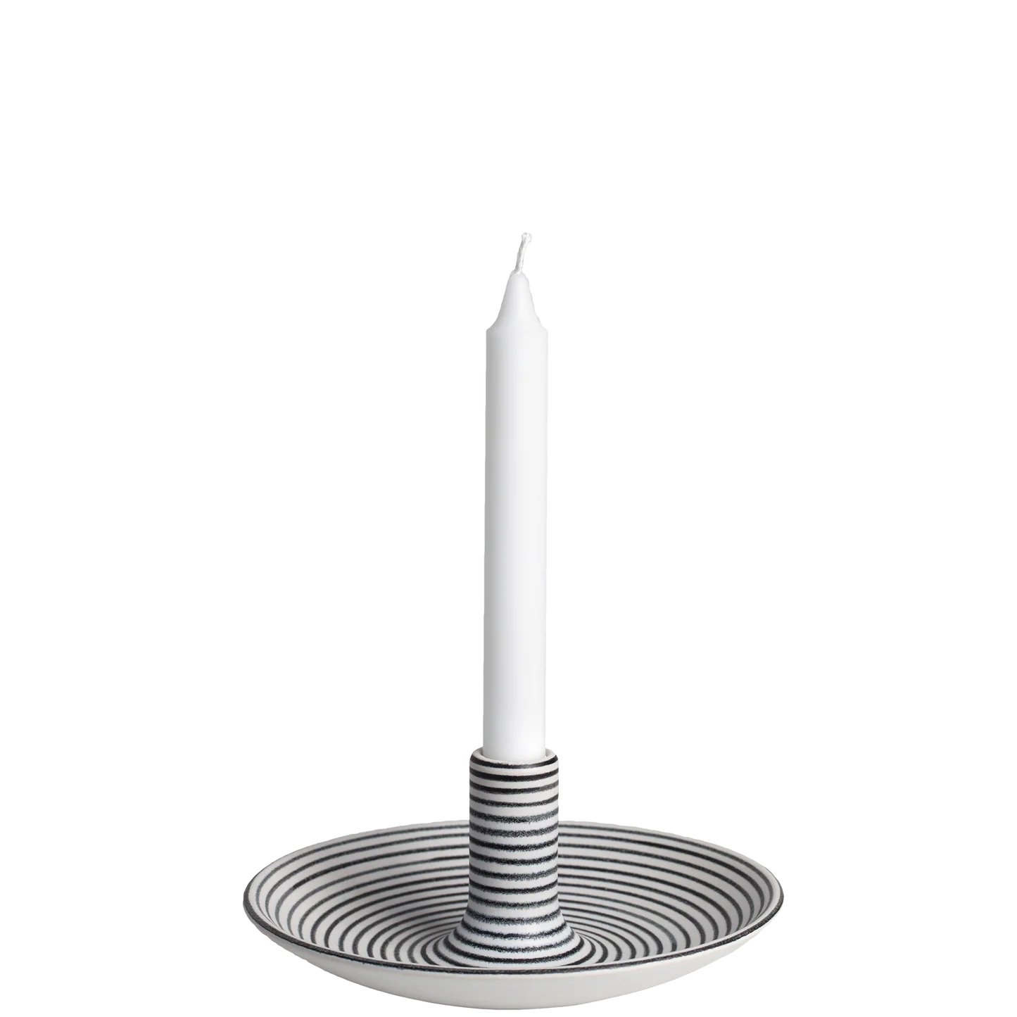 Linje är en serie handdrejade ljusfat, ljusstakar, skålar och krukor med ett rent och enkelt formspråk. De enkla generösa formerna får liv av handmålade linjer mot en sidenvit glasyr. Vi har grundfärger som svart och grå som kompletteras av säsongens färger som växlar under året.
