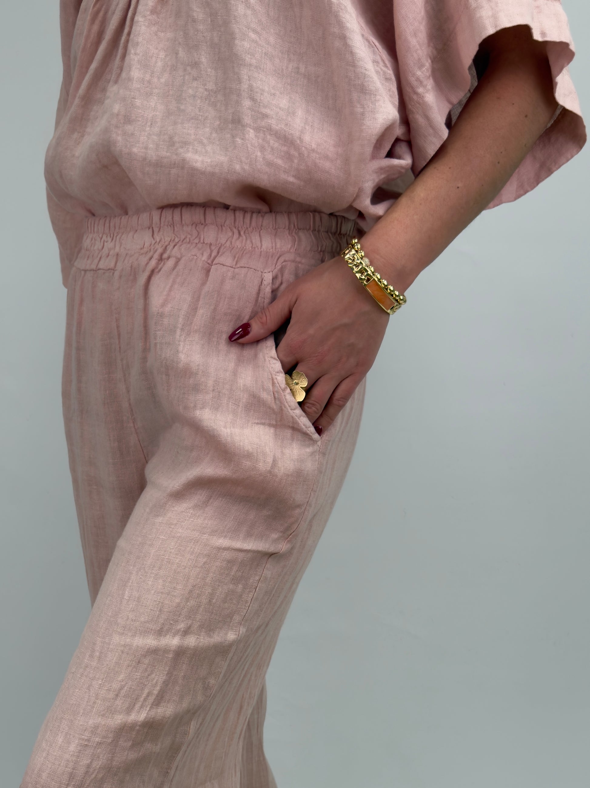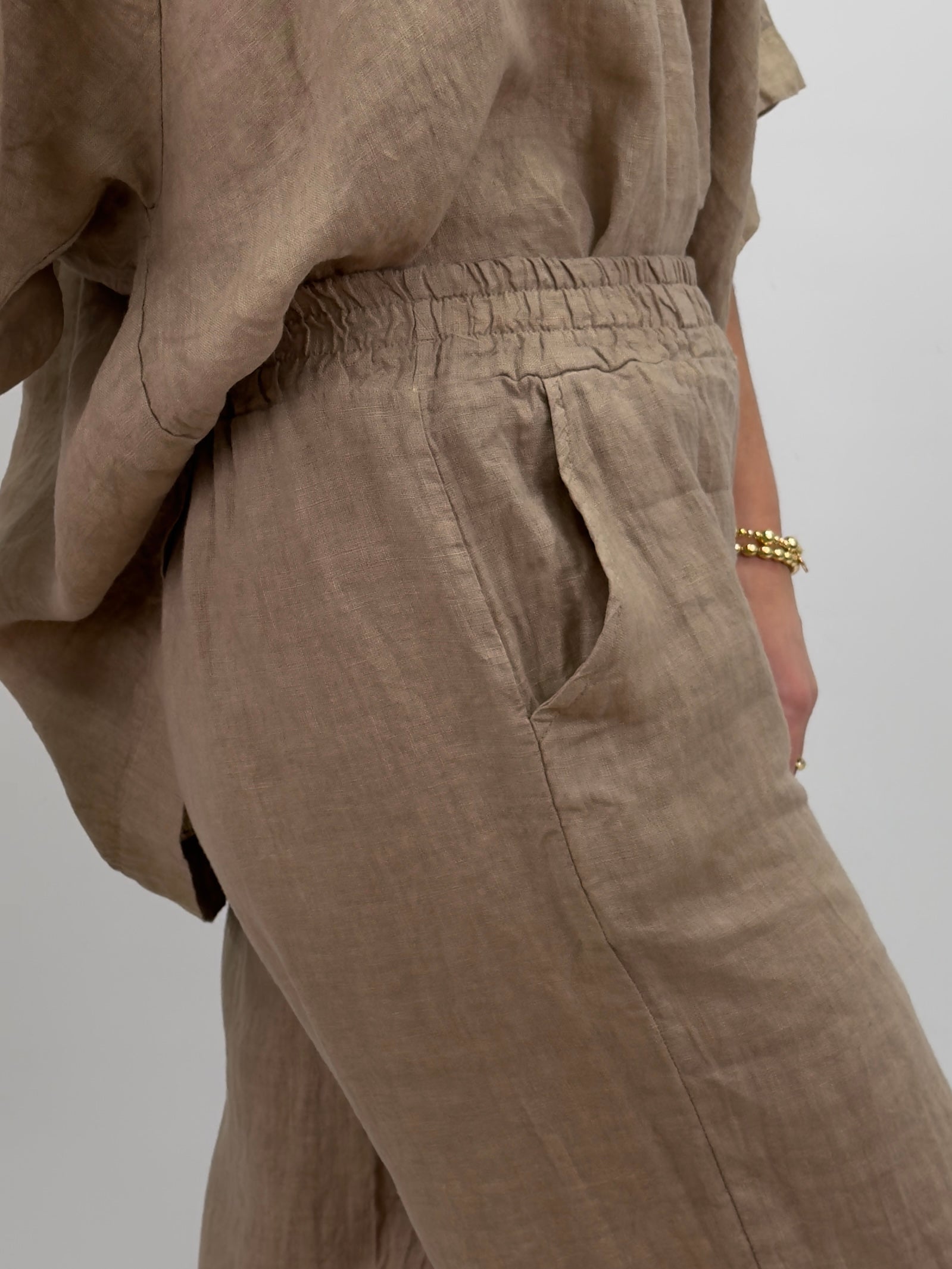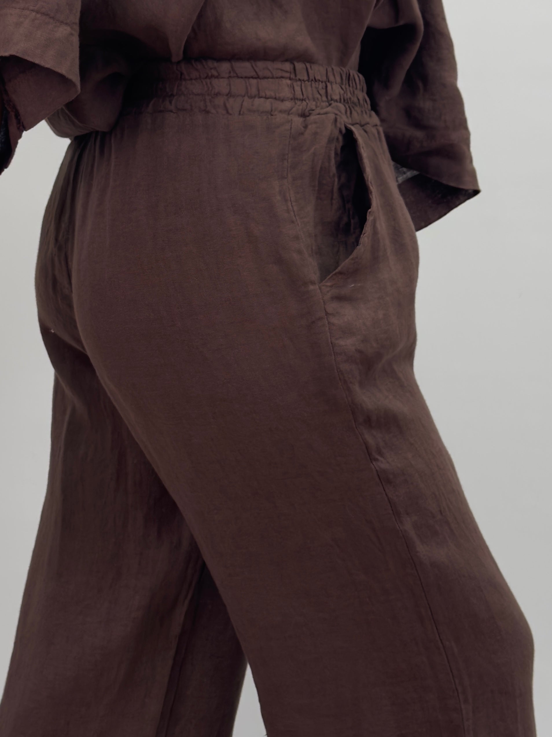 Rosali är ett par bekväma och luftiga linnebyxor med rak, vid passform och resår i midjan. Perfekta för varma dagar – både stilrena och avslappnade.