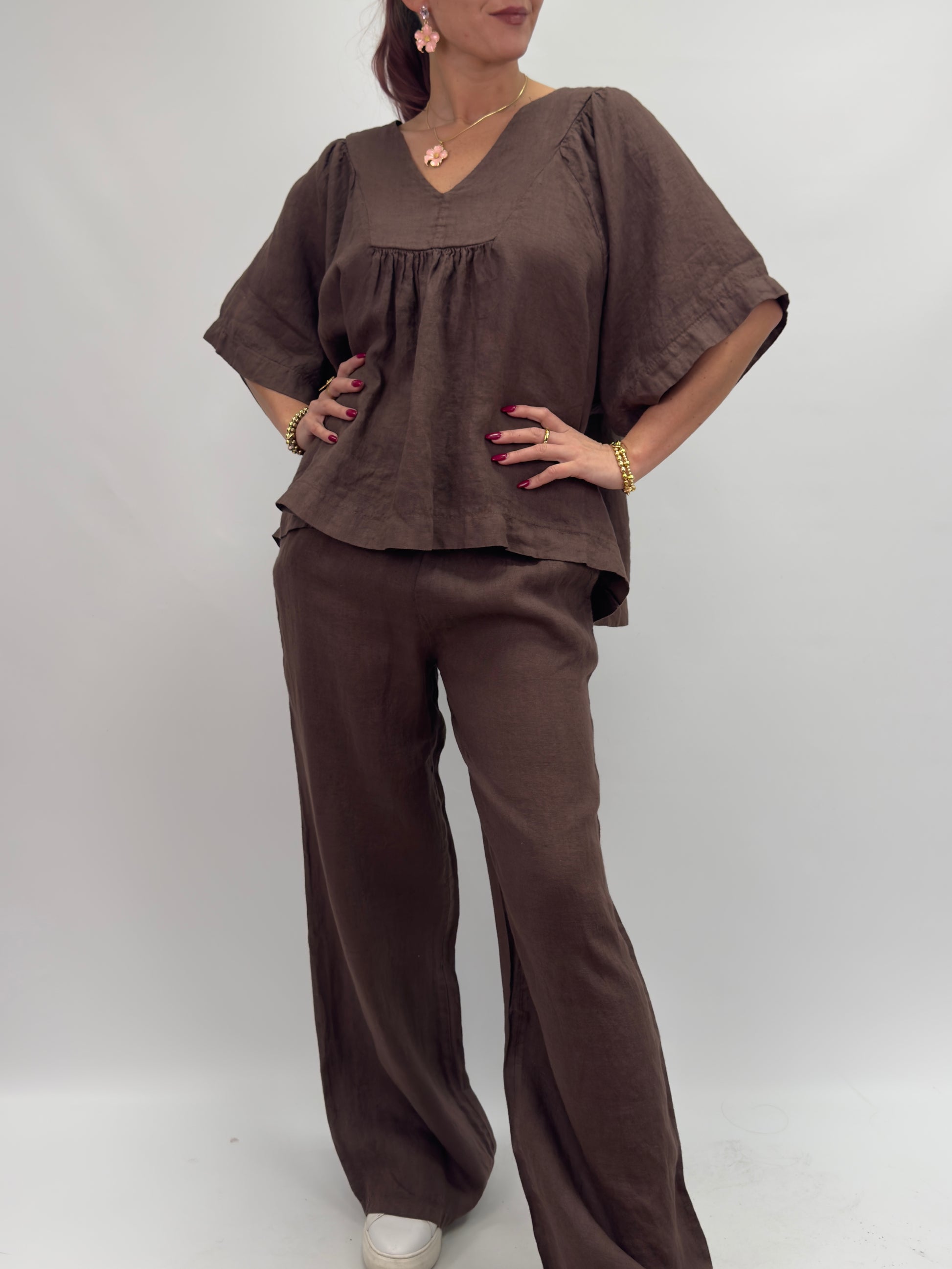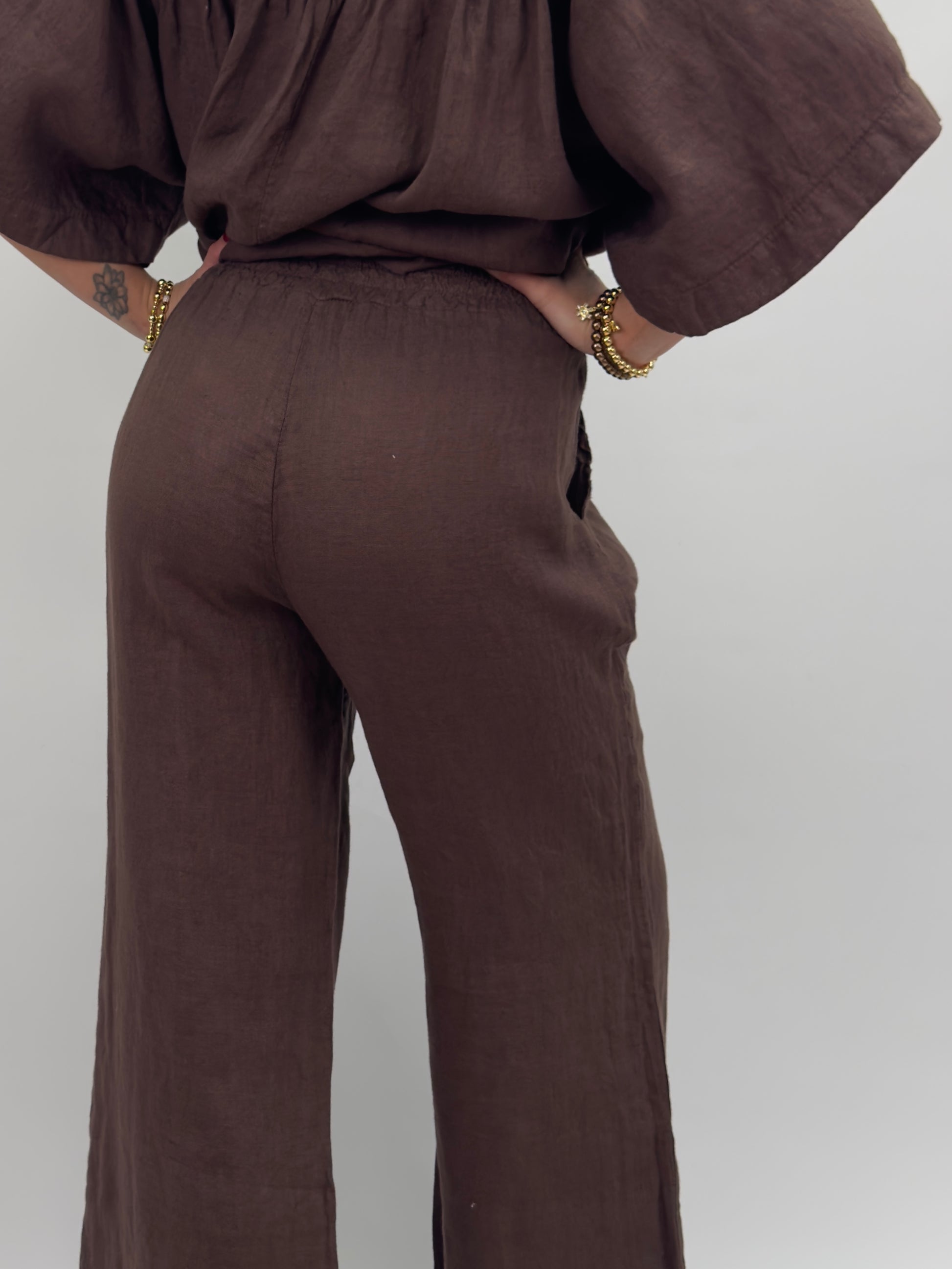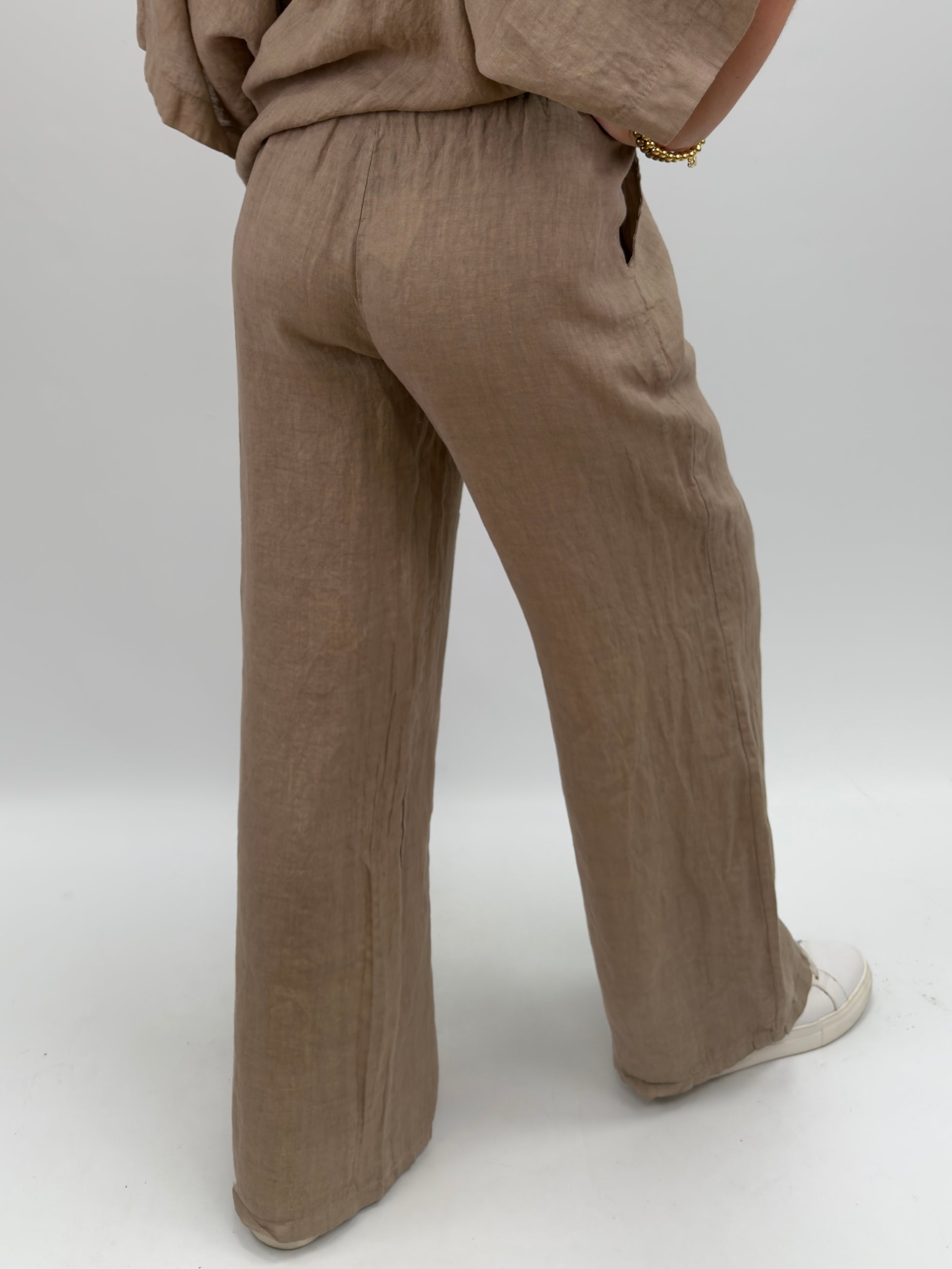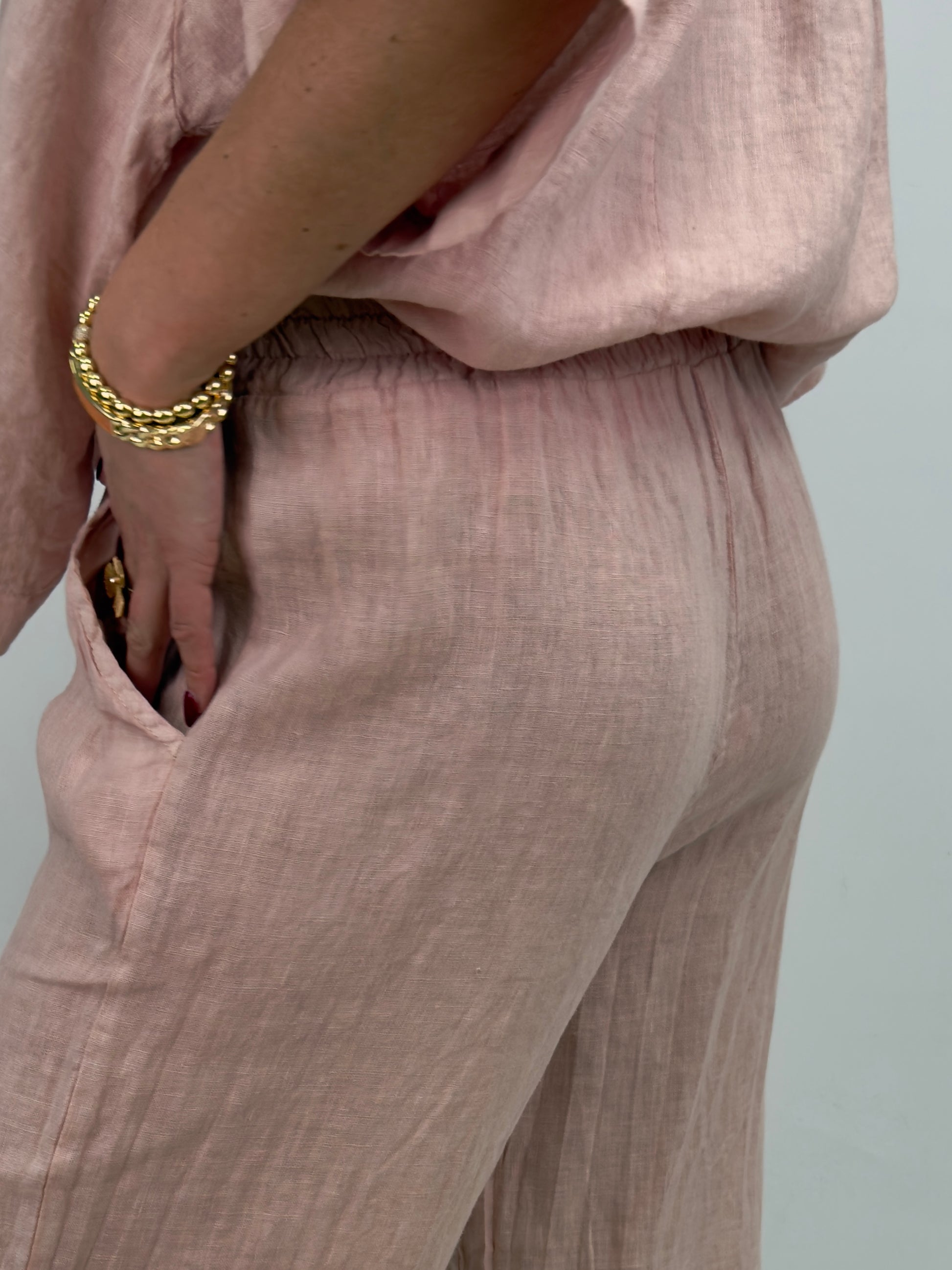Rosali är ett par bekväma och luftiga linnebyxor med rak, vid passform och resår i midjan. Perfekta för varma dagar – både stilrena och avslappnade.