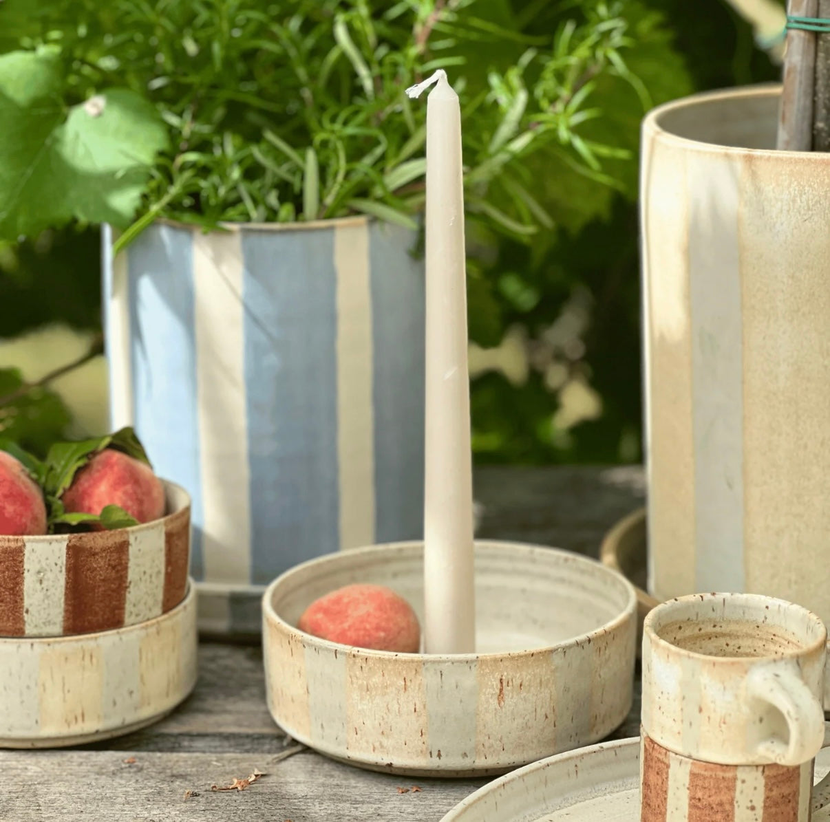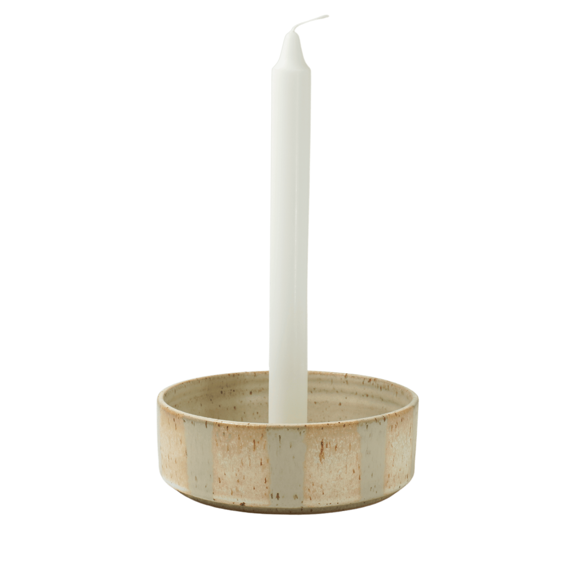 Paradisverkstadens Ljusfat i serien Öland med handmålad glasyr. De breda/smala linjerna skapar en iögonfallande kontrast mot ljusfatens havrefärgade botten.