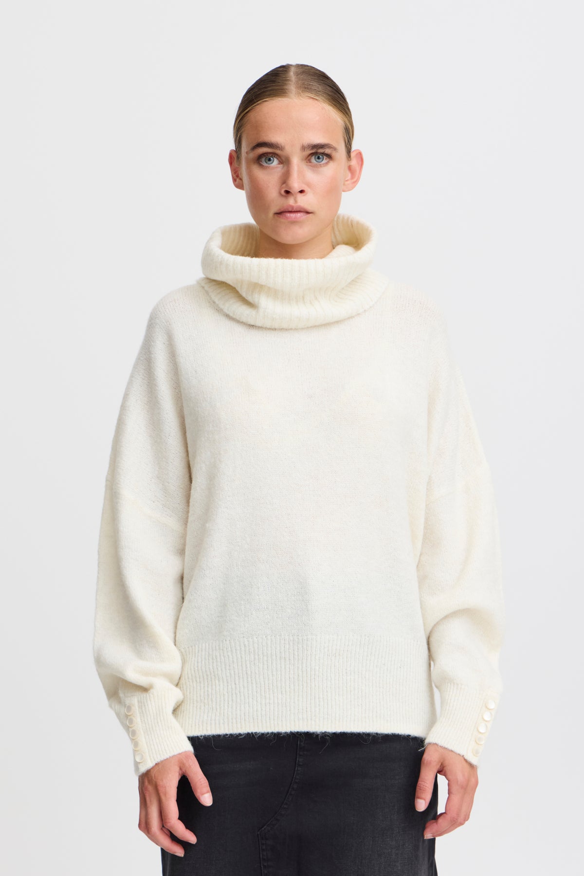 Denna stickade polotröja har avslappnad passform, hög krage och långa ärmar med dekorativa knappar. Bekväm och perfekt för lager på lager och olika tillfällen.