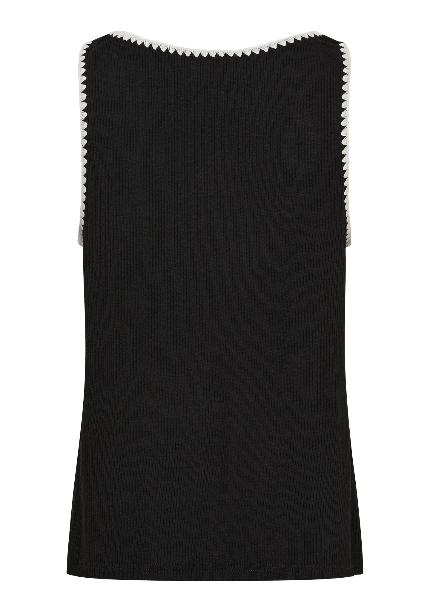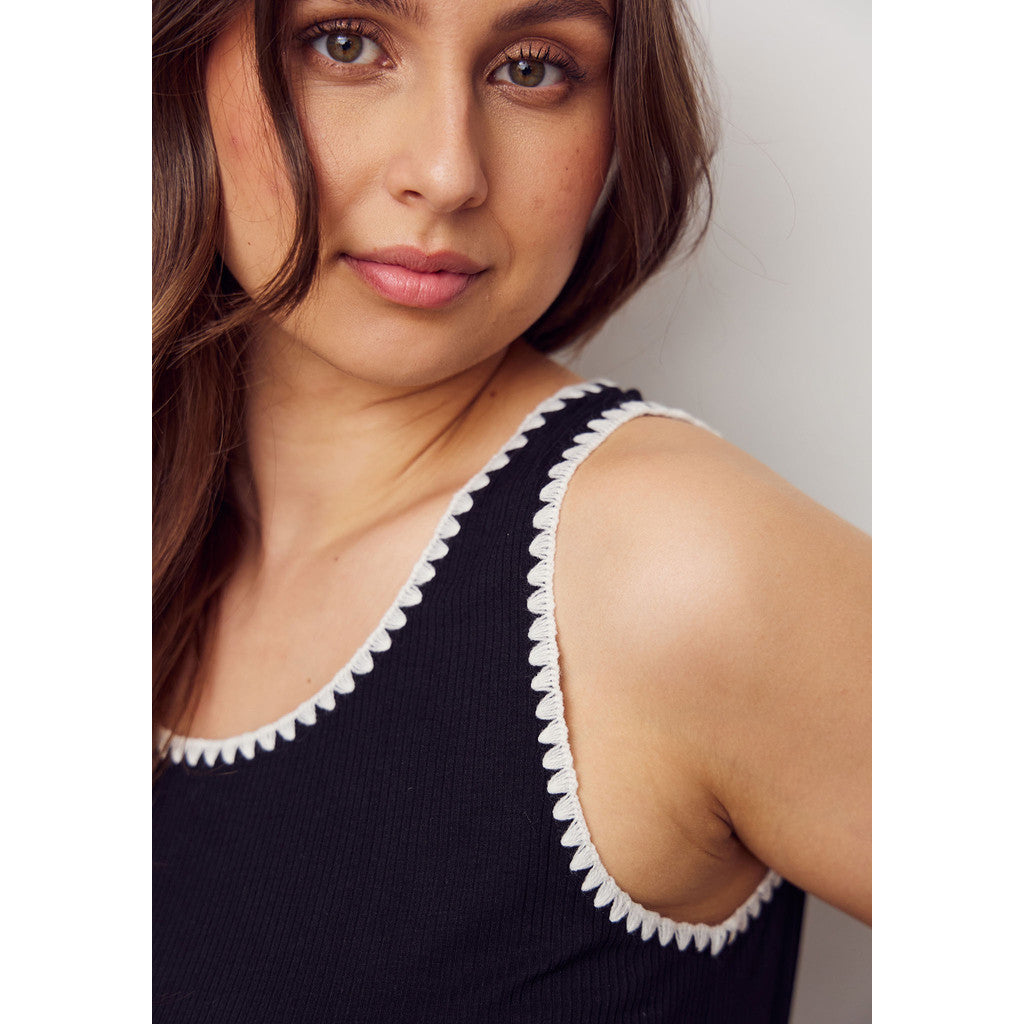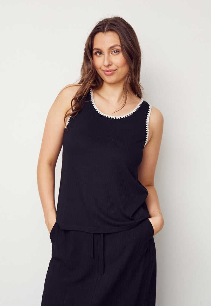 Dee Tank Top är en mångsidig och snygg topp som kombinerar komfort med en trendig look. De dekorativa kontrastdetaljerna vid hals- och armslut lägger till en unik och modern touch, medan det lätta materialet garanterar en skön känsla. Den lösa passformen gör den perfekt för både vardagliga och lite finare outfits.